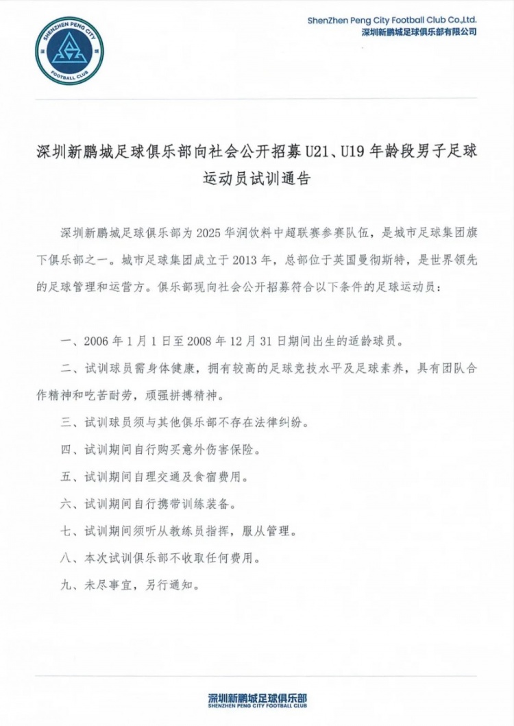 深圳新鹏城足球俱乐部公开招募U21、U19、U17年龄段男子足球运动员试训通告