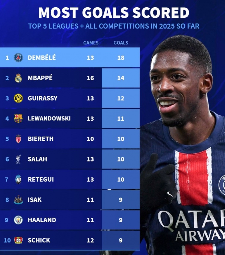- 2025各项赛事进球榜:登贝莱18球居首,姆&哈、莱万、萨拉赫在列