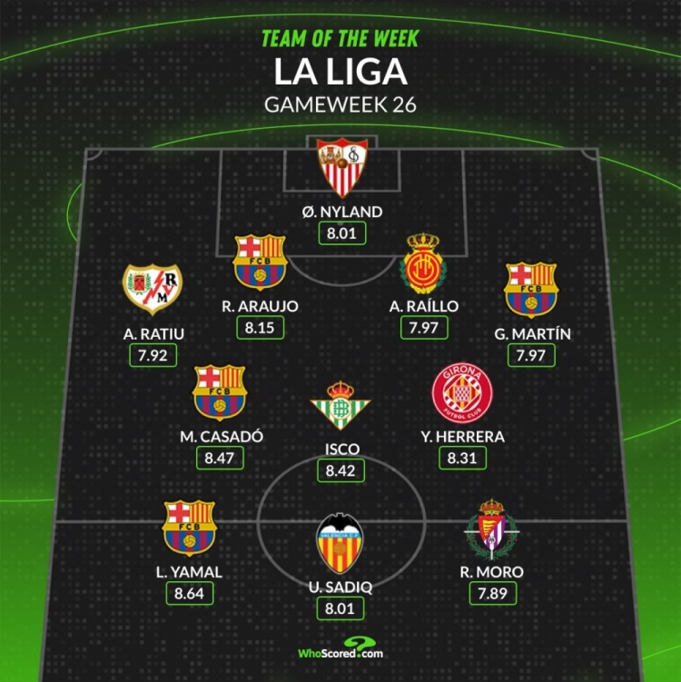 - WhoScored评西甲第二十六周最佳阵:巴萨四名球员入选