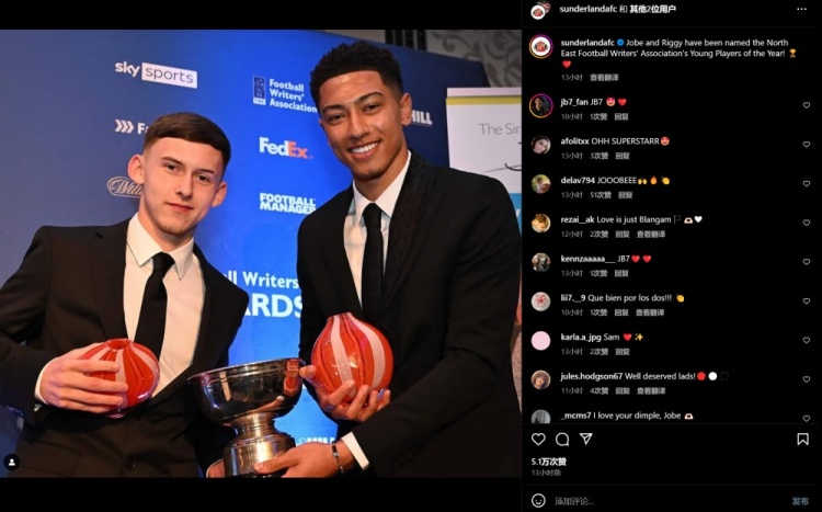 官方:小贝林厄姆获英格兰东北部足球作家协会年度最佳年轻球员奖