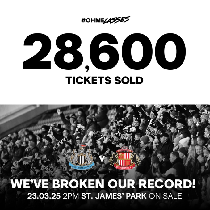 3月20日讯 纽卡女足官方发文,球队在女足英冠主场迎战桑德兰女足的比赛售出28600张票,这创下了纽卡女足的队史纪录。