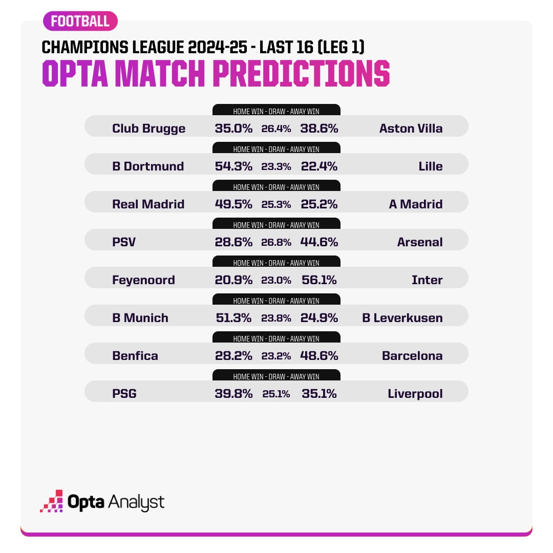 - Opta预测欧冠16强赛首回合:看好国米、拜仁、皇马、巴萨、阿森纳