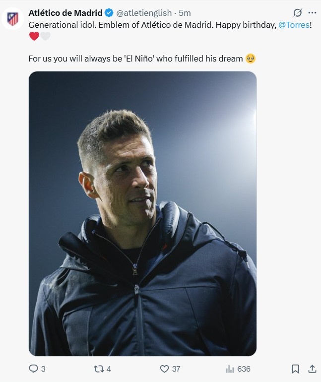 马竞官方表示道:“一代偶像,马竞的象征,生日快乐托雷斯!❤️????对我们来说,你永远是已经实现梦想的圣婴????。”