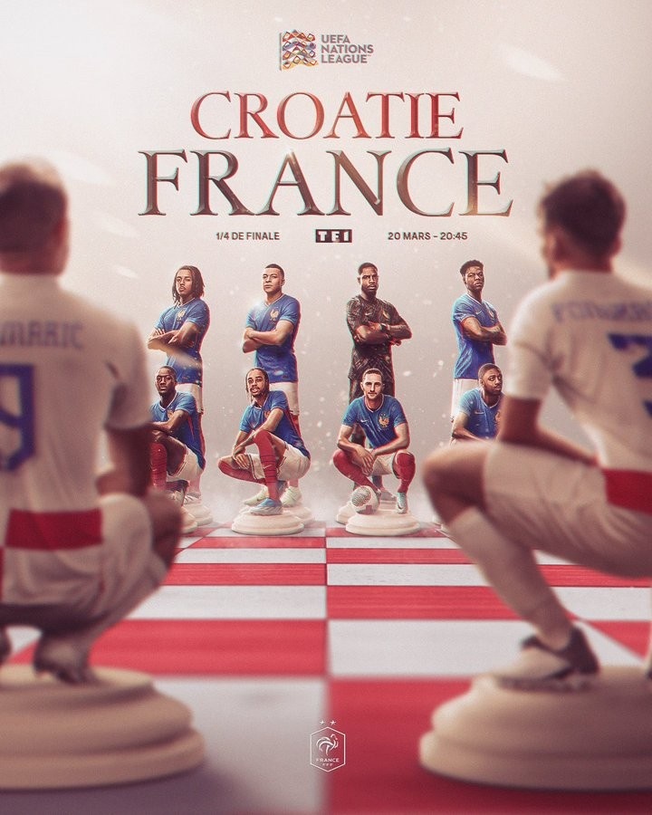 3月20日讯 北京时间3月21日星期五凌晨3点45分,法国将在欧国联1/4赛决赛首回合客场挑战克罗地亚,法国队官方今天晒出了海报,为比赛预热。