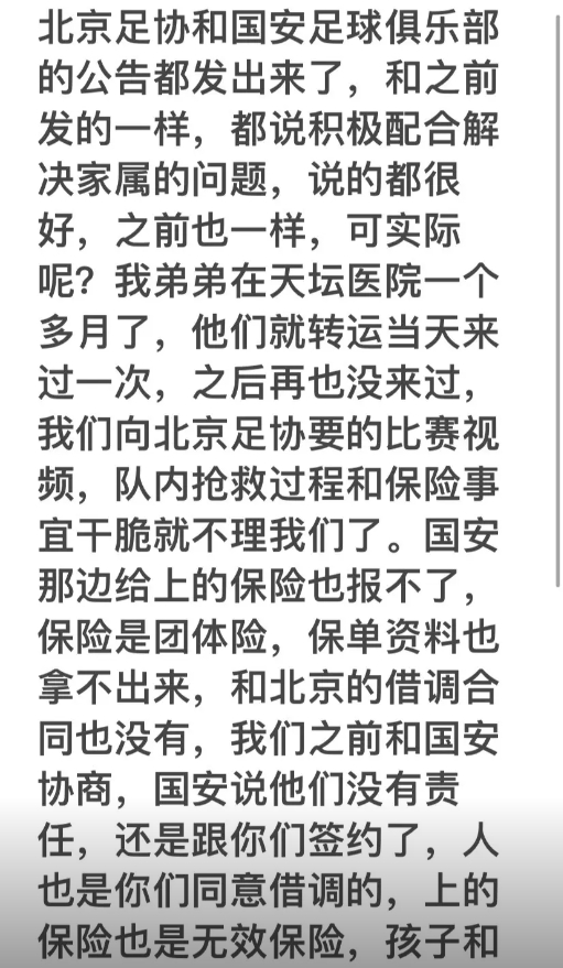 北京足协和国安足球俱乐部的公告都发出来了,和之前发的一样,都说积极配合解决家属的问题,说的都很好,之前也一样,可实际呢?我弟弟在天坛医院一个多月了,他们就转运当天来过一次,之后再也没来过,我们向北京足协要的比赛视频,队内抢救过程和保险事宜干脆就不理我们了。