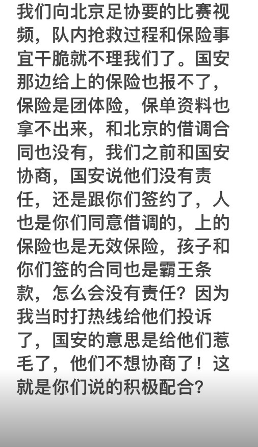 国安那边给上的保险也报不了,保险是团体险,保单资料也拿不出来,和北京的借调合同也没有,我们之前和国安协商,国安说他们没有责任,还是跟你们签约了,人也是你们同意借调的,上的保险也是无效保险,孩子和我们向北京足协要的比赛视频,队内抢救过程和保险事宜干脆就不理我们了。国安那边给上的保险也报不了,保险是团体险,保单资料也拿不出来,和北京的借调合同也没有,我们之前和国安协商,国安说他们没有责任,还是跟你们签约了,人也是你们同意借调的,上的保险也是无效保险,孩子和你们签的合同也是霸王条款,怎么会没有责任?因为我当时打热线给他们投诉了,国安的意思是给他们惹毛了,他们不想协商了!这就是你们说的积极配合?