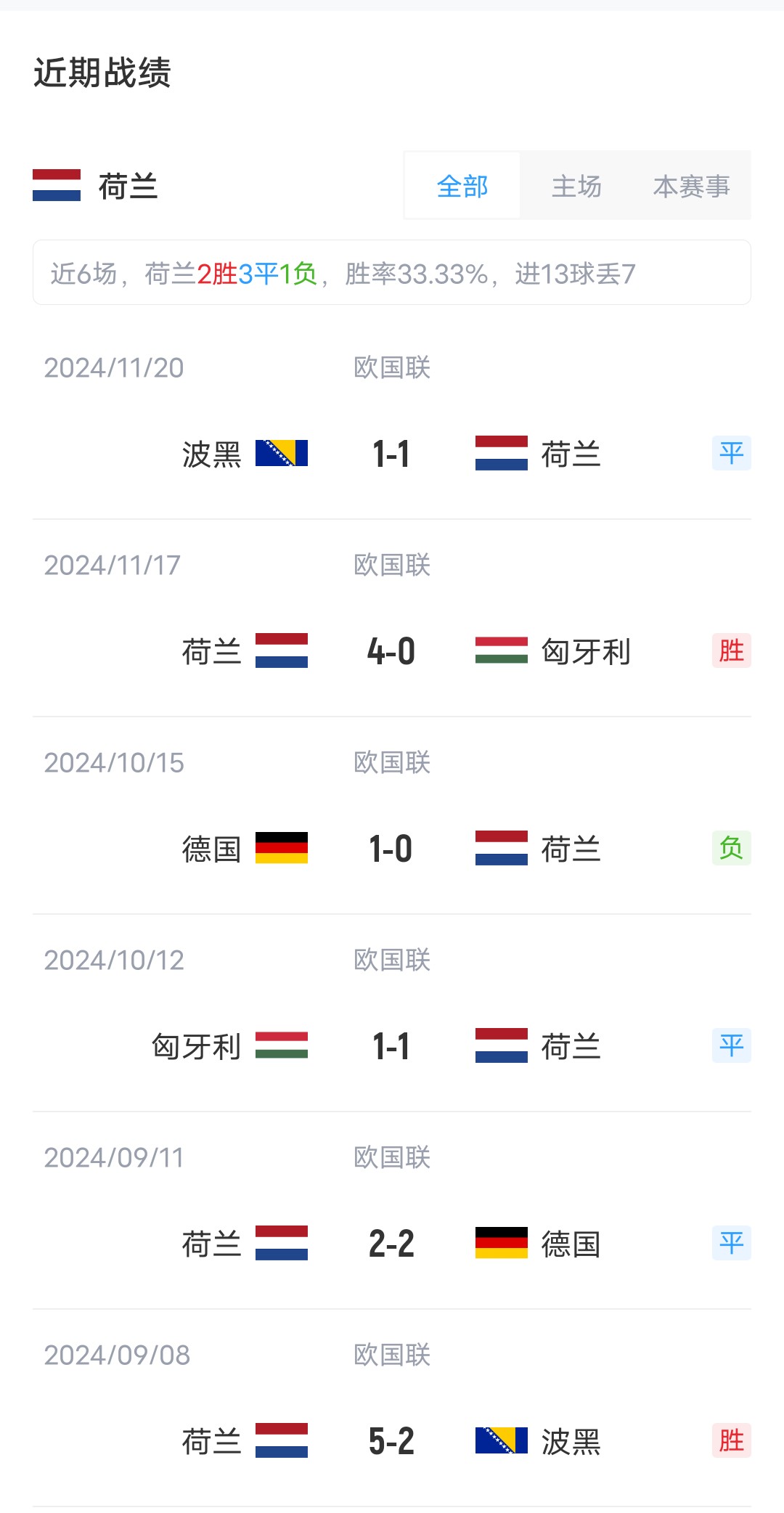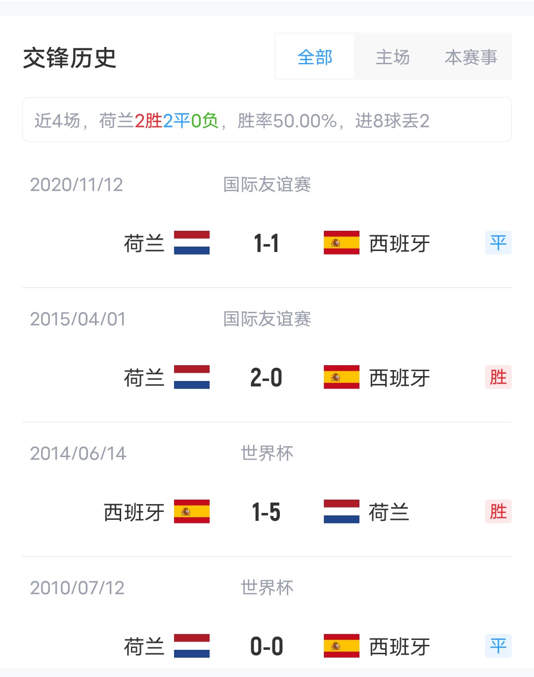 双方近4场交锋,荷兰取得2胜2平的战绩稍居上风。