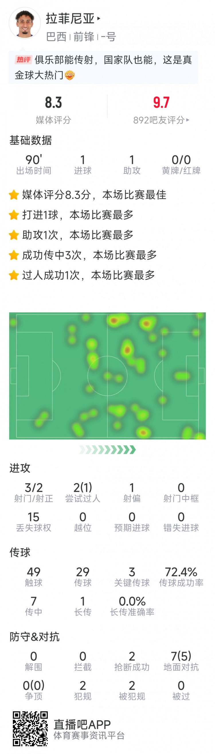 3月21日讯 在本轮世预赛南美区比赛,巴西2-1击败哥伦比亚。本场比赛拉菲尼亚传射建功,以下为他在本场数据: