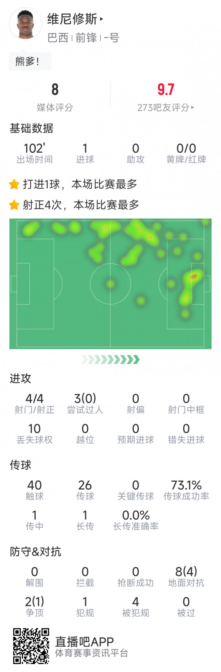 维尼修斯本场数据:打进绝杀,4次射门均射正,5次成功对抗