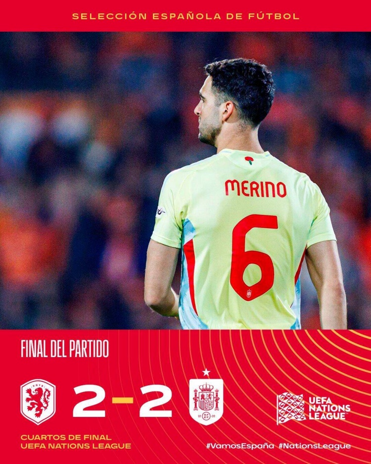 梅里诺补时绝平,荷兰2-2西班牙,西班牙欧国联五连胜终结。