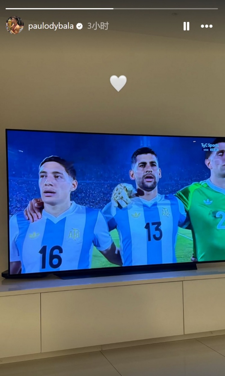 迪巴拉晒出比赛画面,并配上了爱心表情。