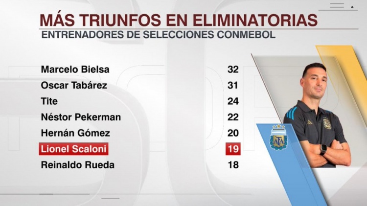 据ESPN统计,此役是斯卡洛尼带领阿根廷队在南美世预赛取得的第19场胜利,世预赛胜场数排名南美国家队主帅第6位。