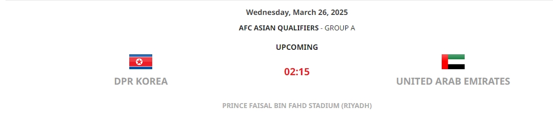 亚足联官网显示:朝鲜主场对阵阿联酋的比赛,将在沙特利雅得进行