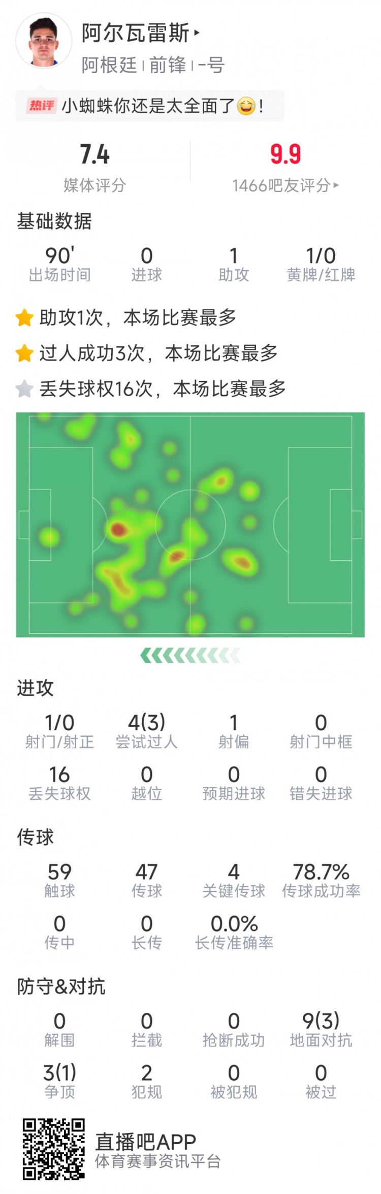 阿尔瓦雷斯本场数据:1次助攻,4次关键传球,3次成功过人