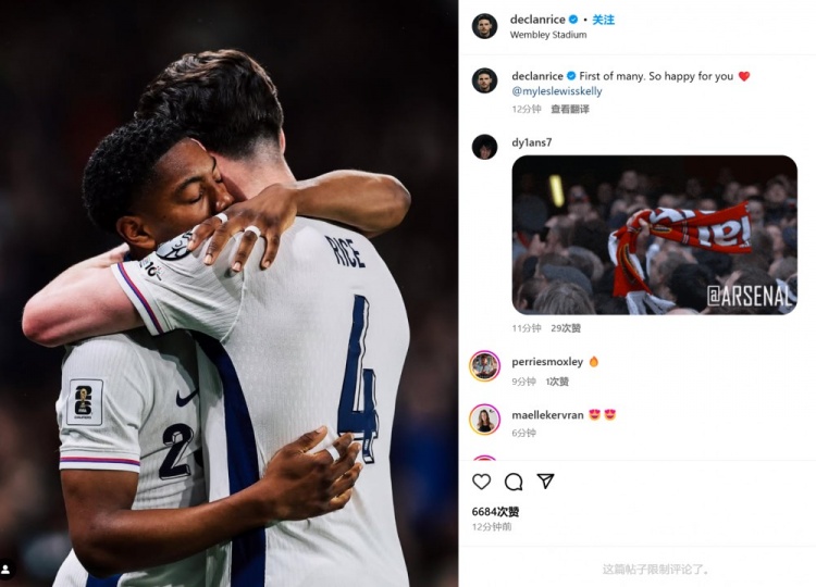 作为双料队友的老大哥赖斯也在赛后通过社媒晒出两人的拥抱照,并配文:“未来众多进球里的第一个!我为你感到非常开心❤️@斯凯利”。