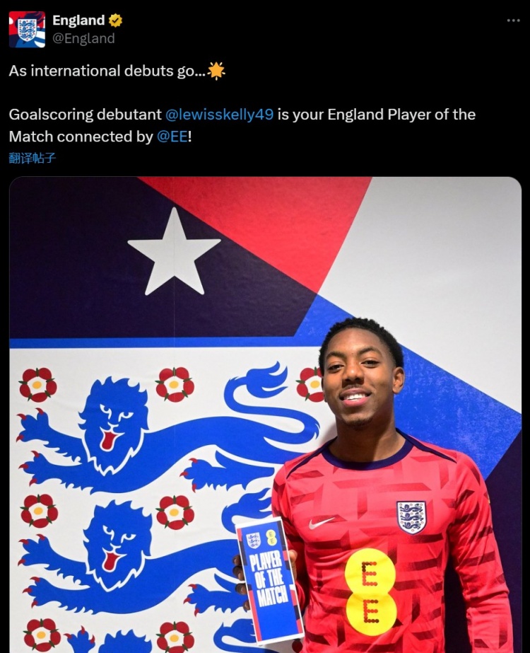 英格兰队官方也在赛后宣布,首秀破门的小将斯凯利被英格兰球迷票选为本场比赛队内最佳球员。