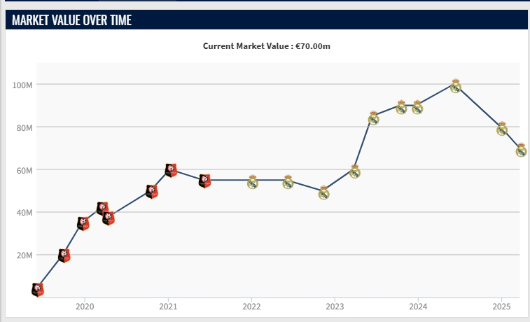 昨日德转更新西甲球员身价,22岁的皇马中场卡马文加再降1000万,最新身价为7000万欧。