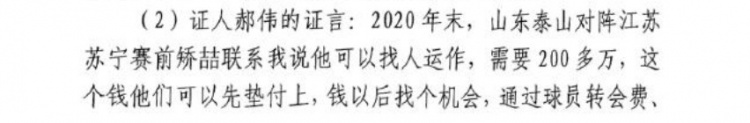 2020年末,山东泰山对阵江苏苏宁赛前矫喆联系我说他可以找人运作,需要200多万,这个钱他们可以先垫付上,钱以后找个机会,通过球员转会费、签字费把钱赚回来,我同意了,矫喆就去做江苏球员“工作”,加上我这边让球员全力以赴去踢,最终这场比赛的比分是山东泰山队2-0江苏苏宁,我们(足协杯)夺冠了。矫喆和我说他们运作这场球花了200万,这个钱是矫喆他们出的。我没有主动还过这个钱,但是我把矫喆招到我们队当助理教练了,给他找了个工作,也算是还他帮我的运作这场比赛的人情了。