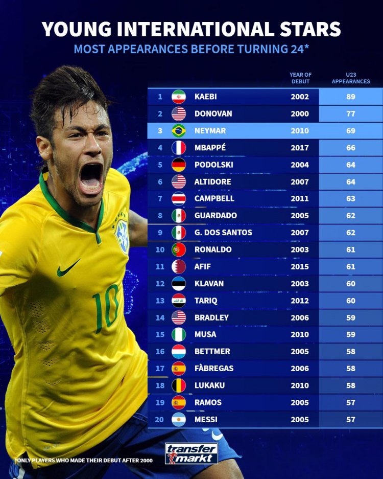 3月23日讯 德国转会市场统计球员24岁之前在国家队的出场次数,并列出榜单,内马尔69场排名第三位,C罗61场,梅西57场。