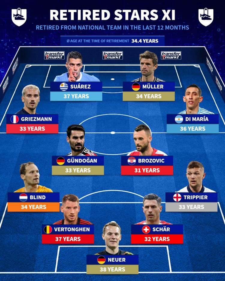 德转列近一年国家队退役球星阵容(平均年龄34.4岁)