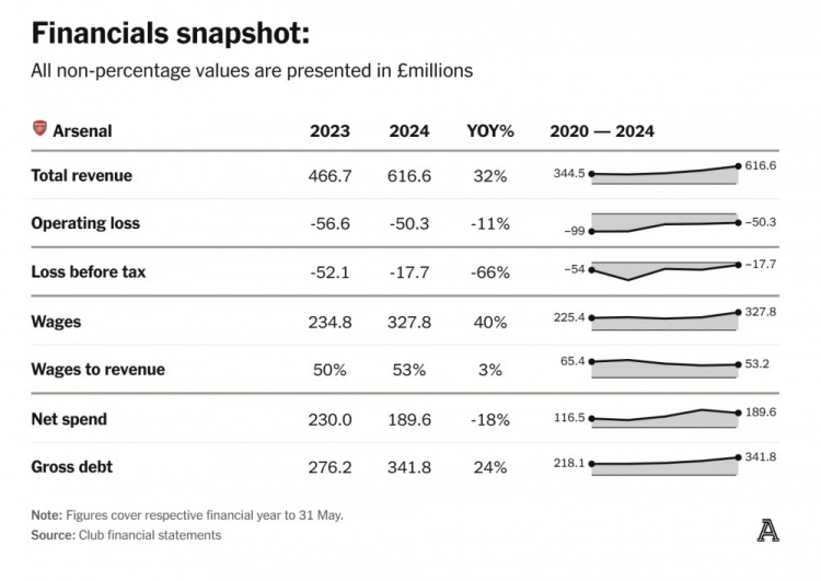 阿森纳财务状况一览(总收入、运营亏损、税前亏损、工资、工资收入占比、净支出、总债务等数据),所有非百分比数值均以百万英镑为单位