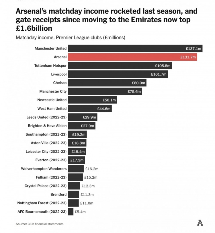 所以,那个赛季阿森纳拿下了单赛季队史最高门票收入,国内比赛日收入跃升联赛第二位。去年阿森纳的比赛日收入仅比曼联少了550万英镑,这也意味着两队之间的差距明显缩小:此前两个赛季,两队的比赛日收入都相差超过3000万英镑。尽管酋长球场的建设成本,可能在过去几年里限制了球队的发展,但如今搬迁的好处正在越来越明显。