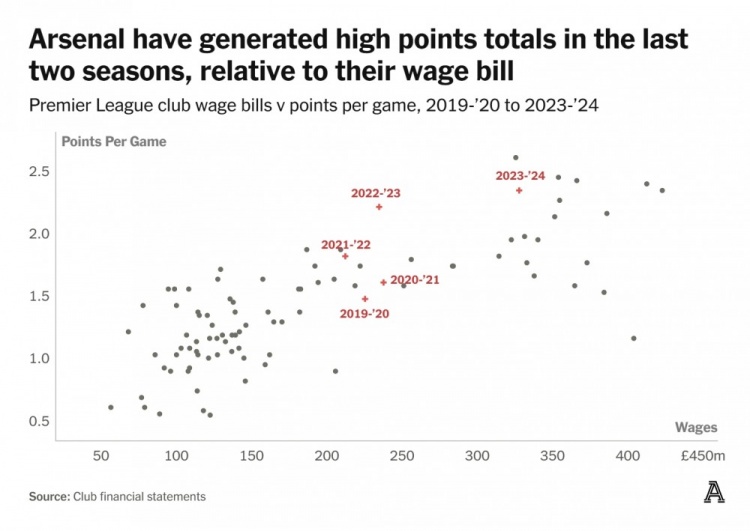 这也只是部分说明了这一成就。想想看,在这两个赛季里,阿森纳似乎就是曼城在争冠道路上唯一的对手。尤其是在2022/2023赛季之时,他们的工资账单与冠军球队曼城的工资根本就不在一个级别。在曼城夺得三冠王的那个赛季,他们的工资账单比阿森纳高出了1.88亿英镑。但在上赛季,这一差距明显缩小(尽管仍有8500万英镑的差距)。一方面是曼城的员工成本略有下降,而阿森纳的员工成本大幅提升。