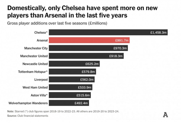 过去五年,只有切尔西在转会市场上的投入超过阿森纳
