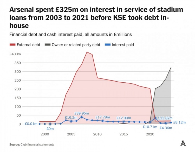2003年到2021年,KSE内部承担债务之前,阿森纳在球场贷款利息上花费了3.25亿英镑