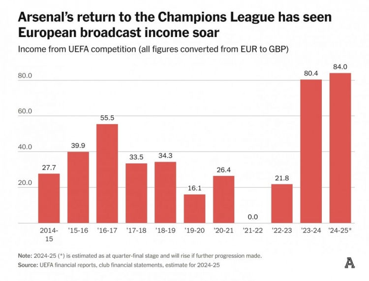 重返欧冠联赛之后,阿森纳在欧战赛事中获取的转播收入飙升