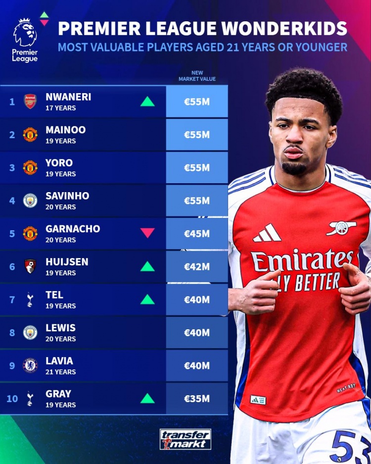 3月19日讯 德国转会市场更新了英超U21球员的最新身价,并列出身价榜单,恩瓦内里、梅努、约罗、萨维尼奥5500万欧并列居首。