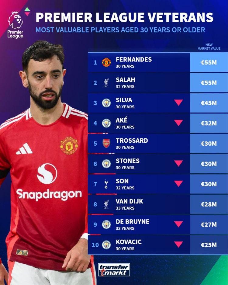 英超年龄30+球员身价榜:B费、萨拉赫5500万欧居首,B席第三