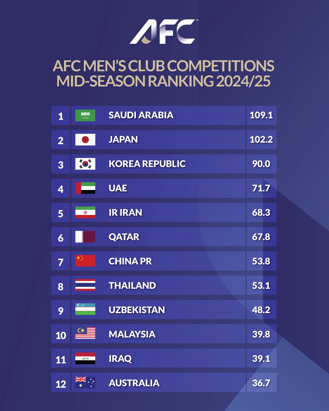 03月04日讯 亚冠精英联赛赛前,亚足联公布了季中各国联赛积分,中超被泰超追分,仅领先0.7分。