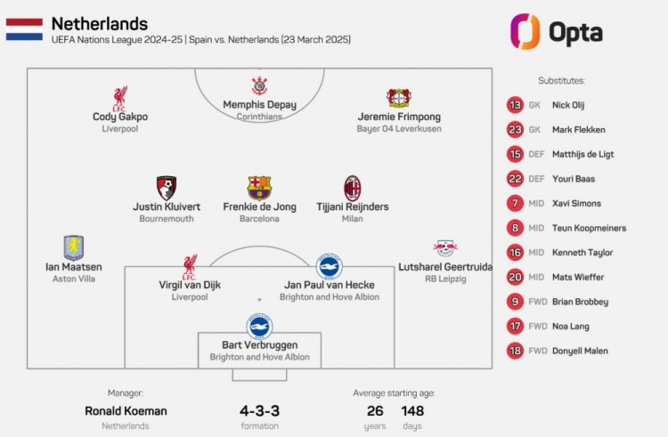 3月24日讯 欧国联1/4决赛次回合,荷兰前往客场挑战西班牙。本场比赛,荷兰主帅科曼排出了一套没有任何荷甲球员的首发阵容,2017年11月9日以来首次出现如此局面。