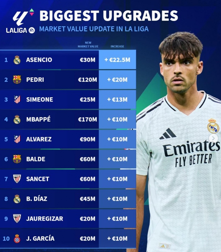 西甲身价升值榜:劳尔-阿森西奥、佩德里领衔 姆巴佩、小蜘蛛在列