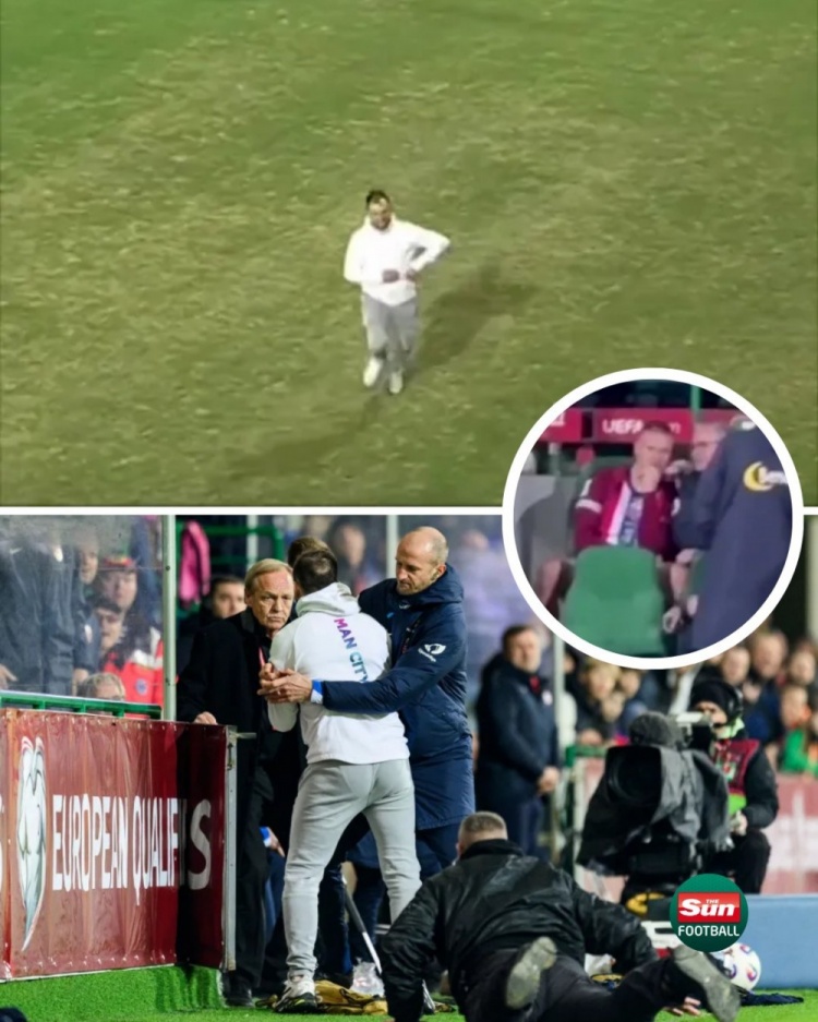 3月24日讯 据《太阳报》报道,在挪威队5-0大胜摩尔多瓦的比赛中,一名球迷冲入球场找哈兰德。