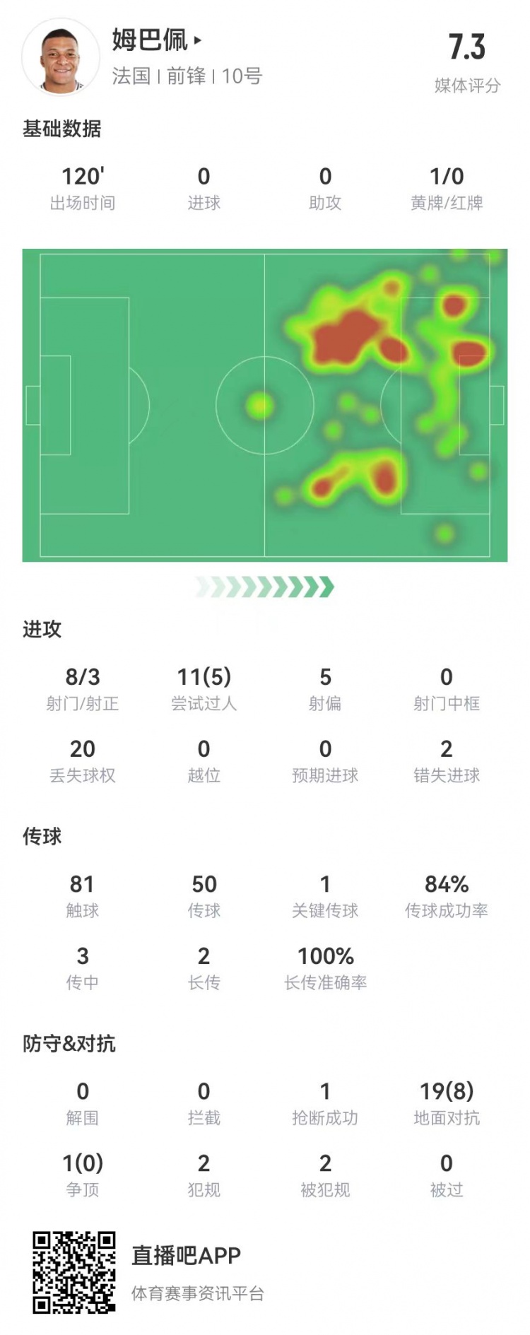 姆巴佩本场8射3正+2失良机+点射命中 20对抗8成功+20丢失球权