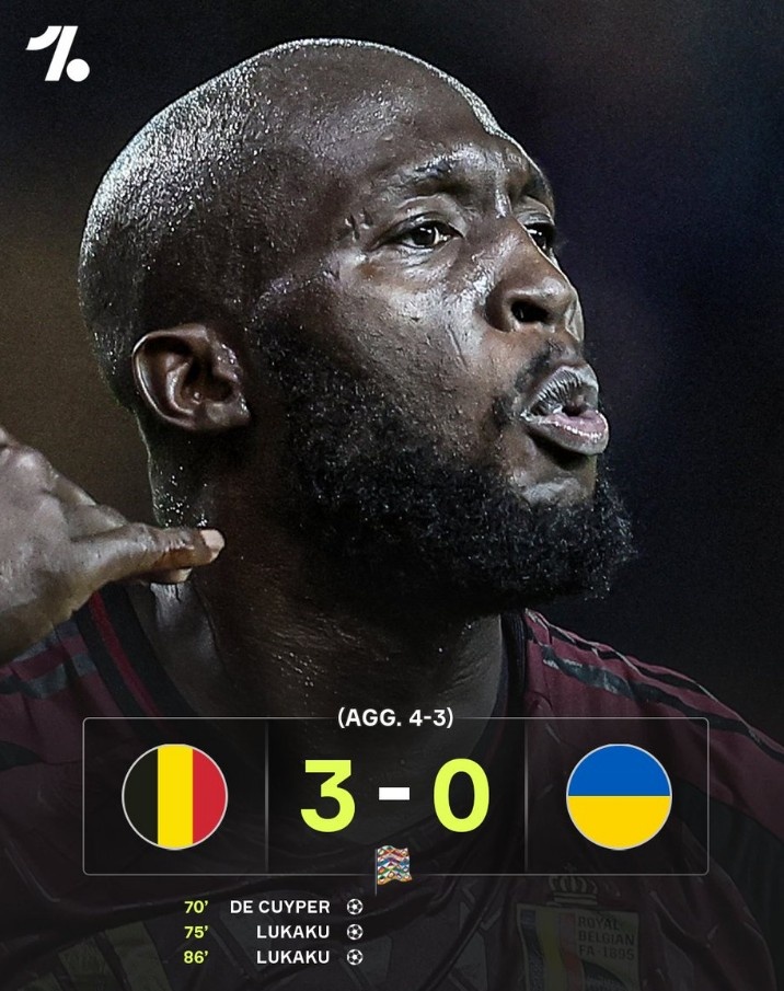 欧国联升级赛次回合比利时3-0击败乌克兰,卢卡库梅开二度