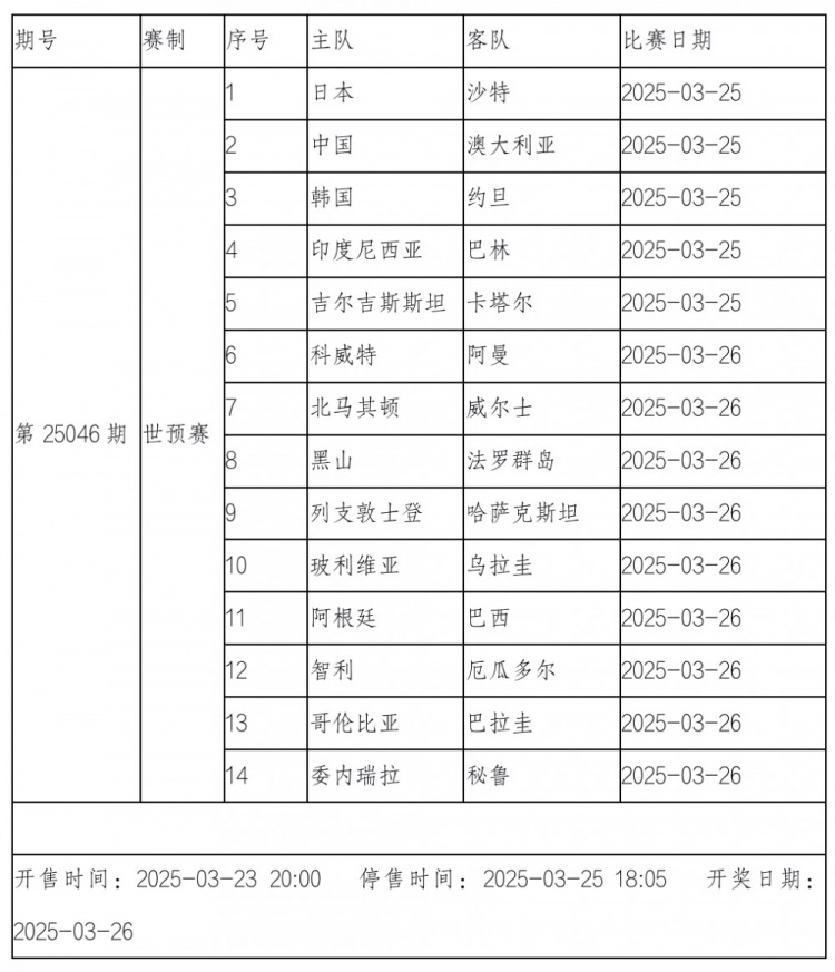 传足胜负彩第25046期竞猜赛事为亚洲区、欧洲区和南美区的世界杯预选赛。本期,亚洲区中国、日本和韩国东亚三强将分别在主场对阵澳大利亚、沙特和约旦,南美区则迎来阿根廷VS巴西的重头戏。