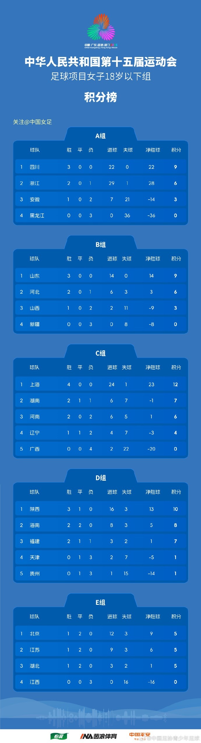全运会女足U18资格赛(CD组)第5轮、(ABE组)第3轮赛果+积分榜