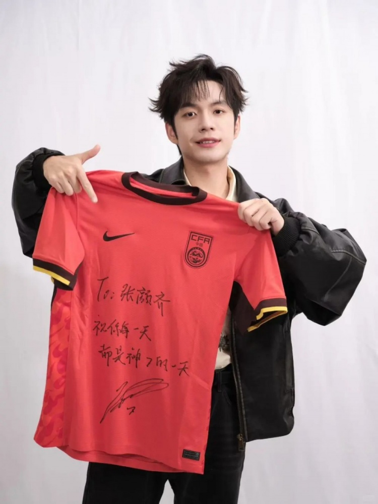 3月24日讯 在个人社媒,歌手张颜齐晒出武磊to签的国足球衣。