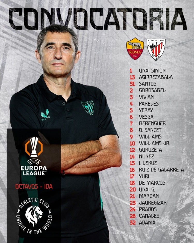 3月4日讯 北京时间3月7日凌晨4:00,欧联杯1/8决赛首回合,毕尔巴鄂竞技将客战罗马。赛前,毕尔巴鄂竞技官方公布了本场比赛球队大名单。