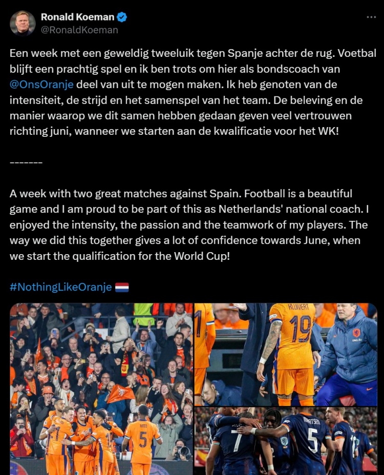 3月25日讯 荷兰在欧国联八强战经历点球大战不敌西班牙,主帅科曼在今日通过社媒发文。