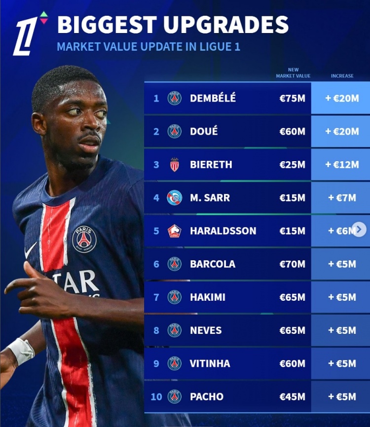 - 法甲身价更新升值榜:登贝莱&杜埃均上涨2000万欧,比雷斯在列