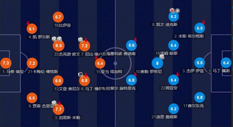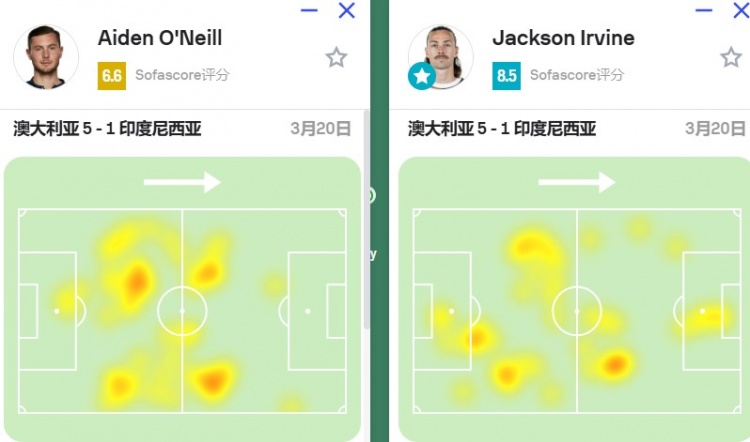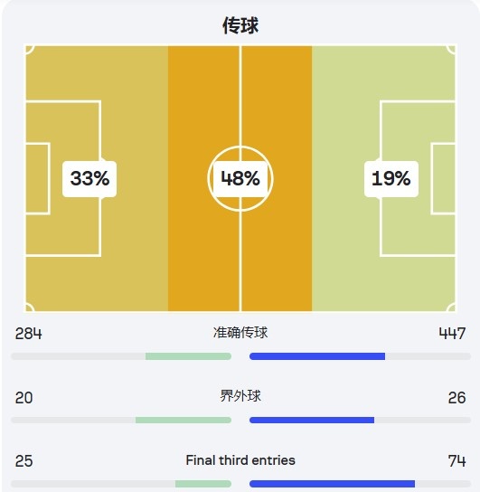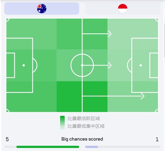 澳大利亚玩的就是效率,控球率、进攻三区进入次数比印尼还少,可比分却是大胜(蓝色方为印尼)