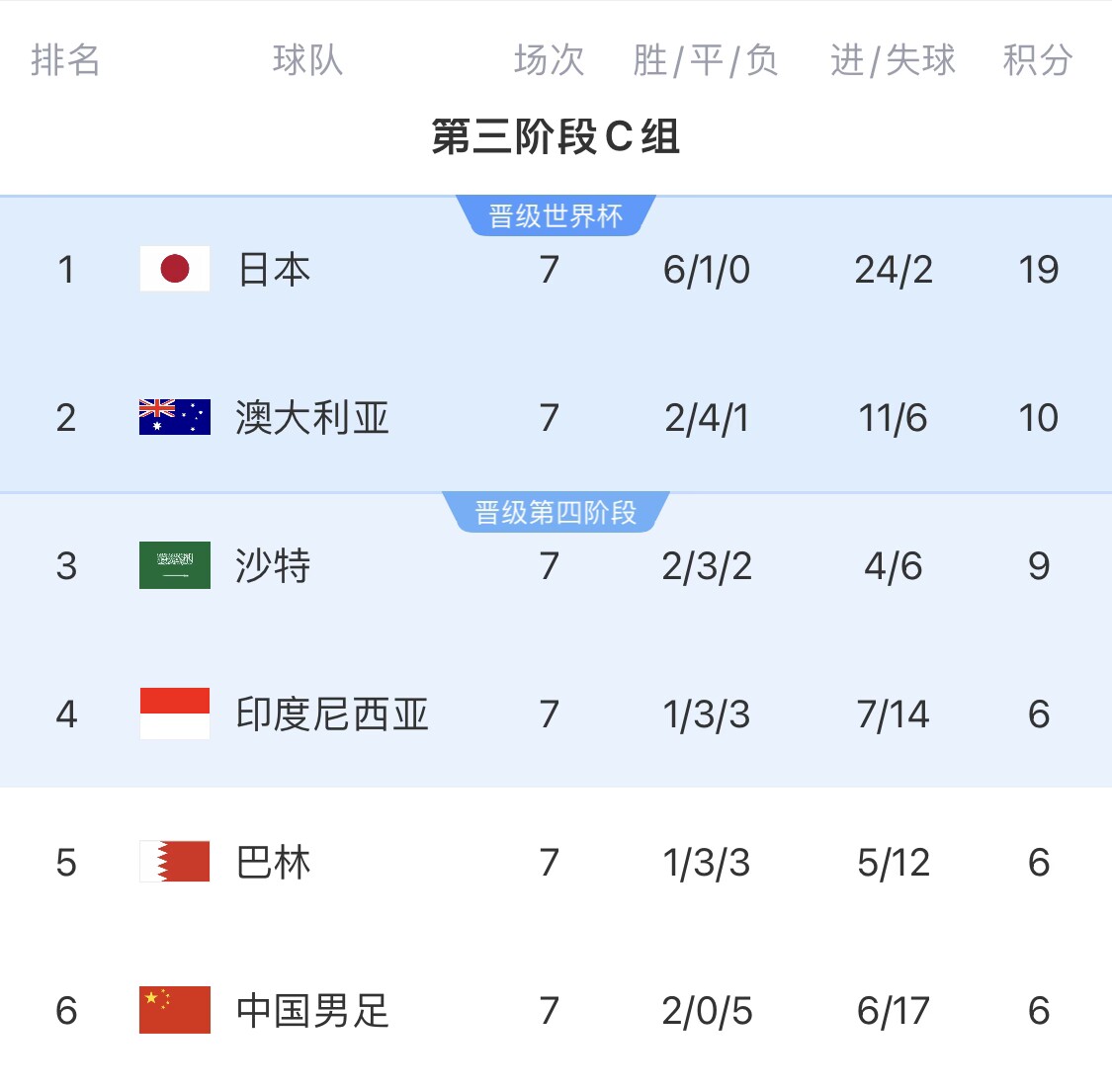 (注:澳大利亚如果战胜中国,积分13,沙特输给日本积分9;接下来的两场哪怕澳洲也输给日本,末轮只要对沙特保持不败即可直通世界杯。在沙特保持第3的情况下,印尼、巴林谁拿分,都会卡住国足上升争四的路线)