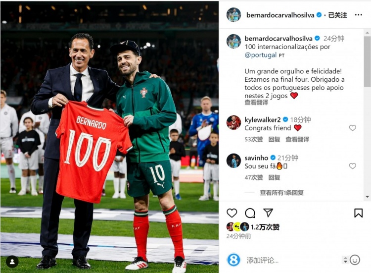 此役是B席为葡萄牙队出战的第100场比赛,因此获赠纪念球衣。他在社交媒体上晒出照片,并写道:“为葡萄牙国家队出战100场比赛,我感到非常自豪和高兴!我们进入了四强,感谢所有葡萄牙球迷在两回合比赛中的支持。”