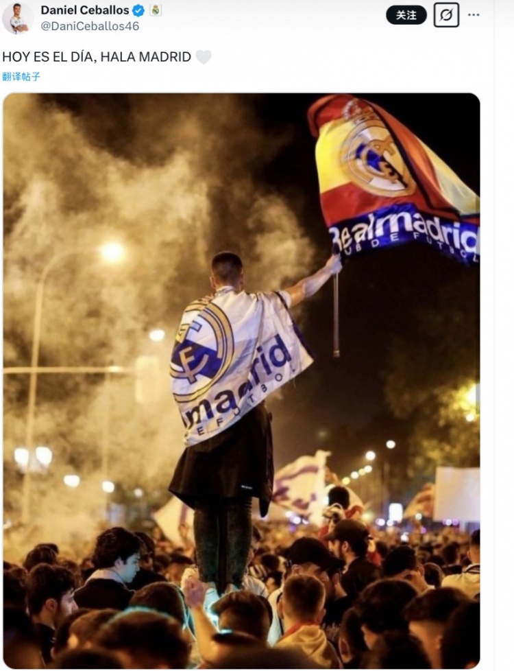 皇马中场塞巴略斯更新社媒,晒出了一张身披皇马队旗的海报,并配文写道:“就在今天,加油皇马!”