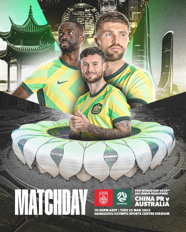 澳大利亚国家队官推发布了本场比赛的海报,三名后卫杰里亚、艾登-奥尼尔和伯吉斯入镜,本场比赛的体育场“大莲花”位于海报下方。