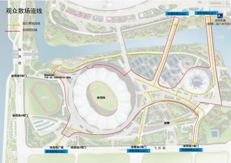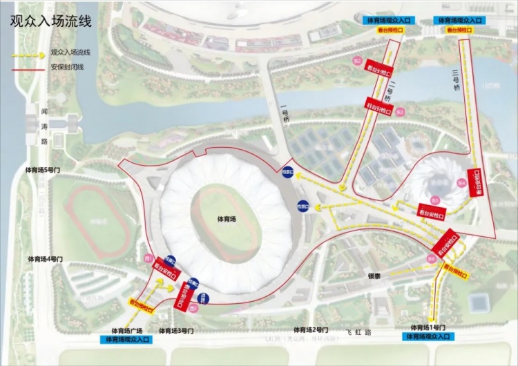 抵达现场的观众,可经由 1 号门、西广场、2 号桥以及 3 号桥前往体育场入口,有序入场。建议龙之队、长城、中国制躁等有组织的球迷通过3号桥专用通道到达安检口。